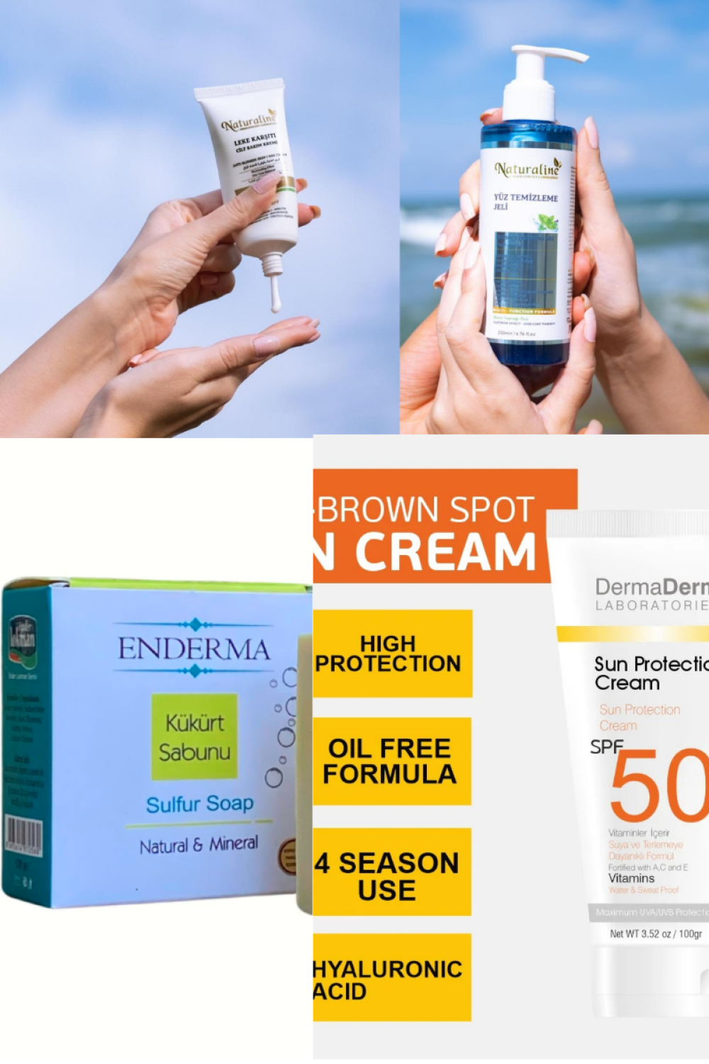 1. Yüz Temizleme jeli 2.leke karşıtı cilt bakım kremi 3.Çay ağacı yağı sabunu 4.Güneş kremi