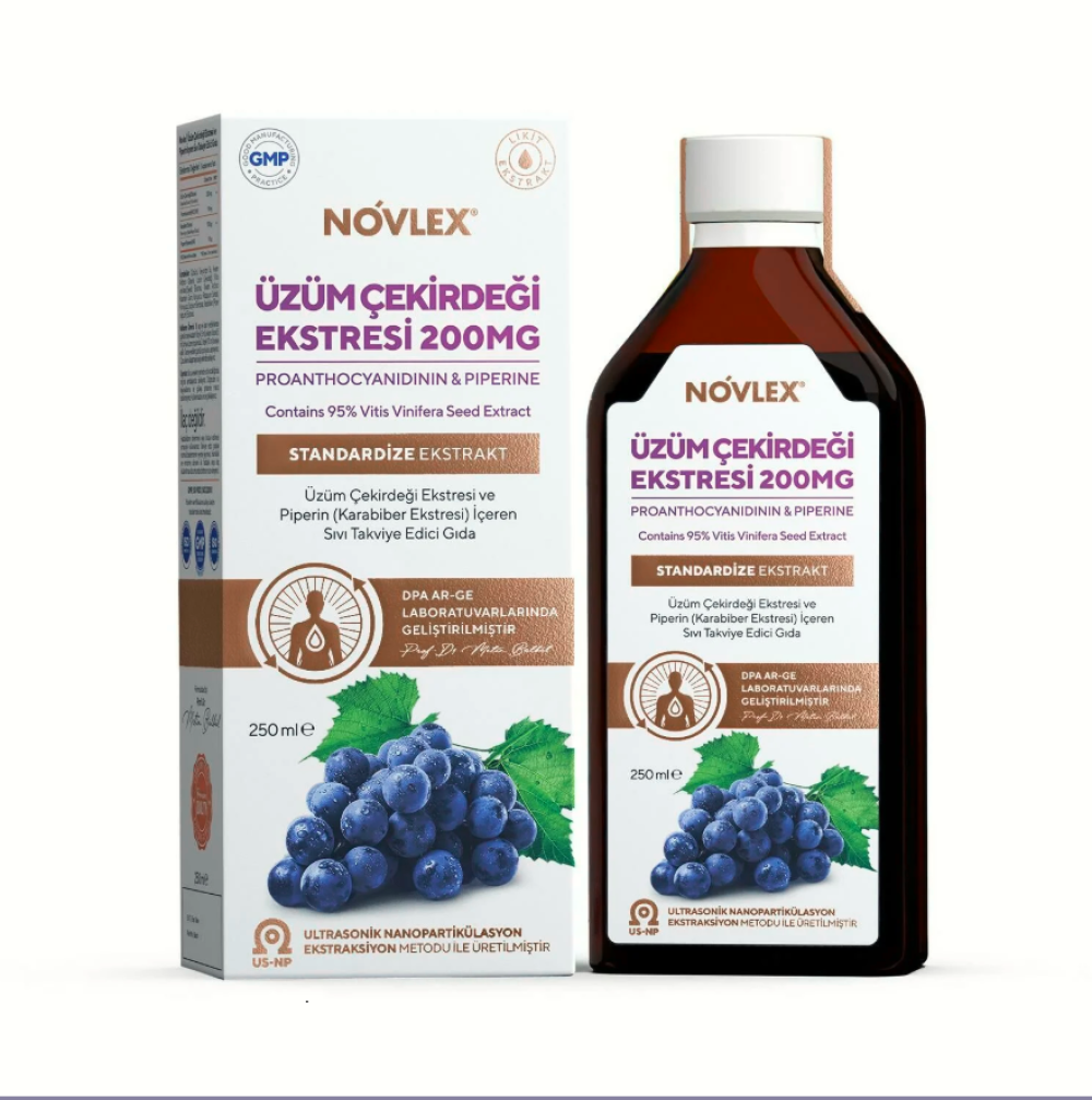 Novlex® Üzüm Çekirdeği (Black Grape Seed) ve Piperin Ekstraktı (Ekstresi) İçeren Sıvı Takviye Edici Gıda 250 ml İçindekiler: Üzüm Çekirdeği (Vitis vinifera)Ekstresi - 200 mg *Proantosiyanidin(PAC) (%95) - 190 mg Karabiber (Piperin) Ekstresi - 100 mikro g