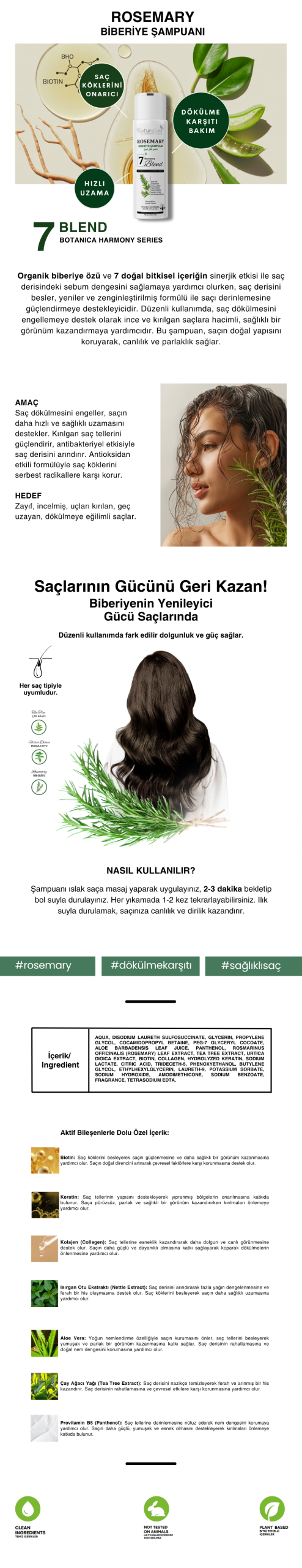 Rosemary Biberiye Şampuanı, biberiye yağının doğal faydalarıyla saç dökülmesini önlemeye yardımcı olur. Saçınıza doğal bir bakım ve güç katın.